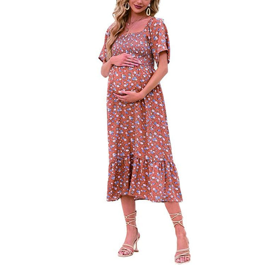 Custom Women Pregnancy Clothes Ruffle Short Sleeve Square Neck Smocked Floral A-Line Maternity Dress